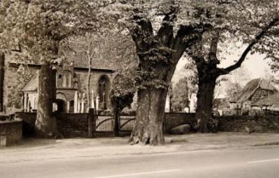 Auf der Suche nach früheren Fotos von der Kirche stellte mir Herr K.H. Sauer dieses Foto zur Verfügung. Es zeigt den Eingang zum Friedhof mit drei großen Linden davor. Der zentrale Baum wurde 1963 gefällt. Demnach muss das Foto vor 1963 aufgenommen worden sein. Die Straße (die alte B3) ist noch zweispurig.