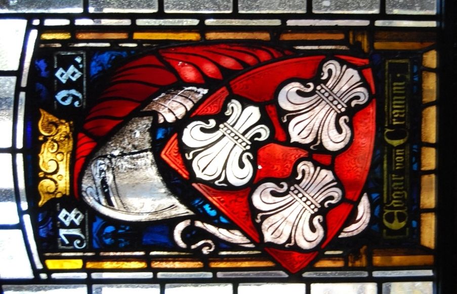Die Glasfenster mit den Wappen in der St. Nikolai-Kirche wurden 1898 von Edgar v. Cramm und Burghard v. Cramm gestiftet. Sie zeigen eine goldene Krone, einen Helm und drei silberne Lilien auf rotem Schild. Der kriegerische Helm und die Lilien der Unschuld passen für uns eigentlich nicht zusammen. Aber das sah man im Mittelalter unter den Rittern anders. Martin Luther widmete unserem Aschwin von Cramm 1525 die Schrift „Ob ein Kriegsmann auch selig werden kann?“. Luther hat das sicherlich positiv gesehen, denn Aschwin unterstützte die reformatorischen Gedanken.